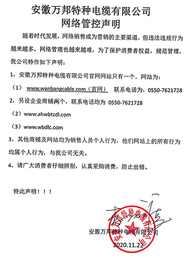 鄭重聲明:安徽萬邦特種電纜有限公司官方網(wǎng)站為:www_wanbangcable_com.hamfj.cn,除此之外無任何子網(wǎng)站或合作網(wǎng)站,其余均為假冒偽劣。電話:0550-7621728 13485756353 地 址:安徽省天長市滁州高新技術(shù)產(chǎn)業(yè)開發(fā)區(qū)經(jīng)四路29號